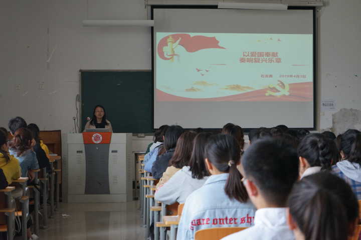 4月3日1:00点yl6776永利集团学生第四党支部书记石宜鑫在实验组团楼244教室为初级入党积极分子上以“爱国奉献奏响复兴乐章”为主题的党课。