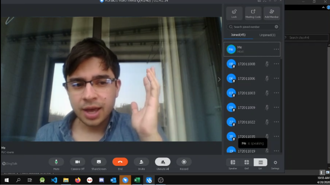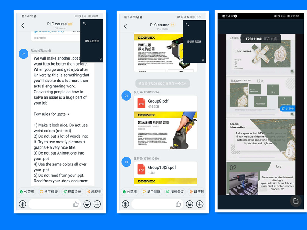 Ronald老师利用线上教学软件钉钉为同学们授课,安排班里同学分为不同的小组,每个小组在每节课布置不同的任务,进行展示,大大提高了同学们的积极性与主动探索的能力。Ronald老师对PLC知识进行专业的讲述与分享,并结合线上网课教学的新形势让同学们对每堂课都充满了期待。