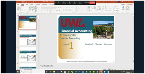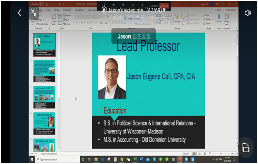 Jason 老师利用线上教学钉钉APP,为经济学的学生进行Financial Accounting在线教学。课堂上,Jason 老师,首先做了自我介绍,并且简单介绍了教学内容的安排。