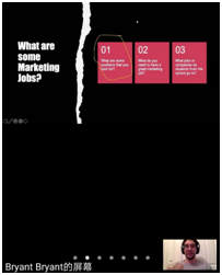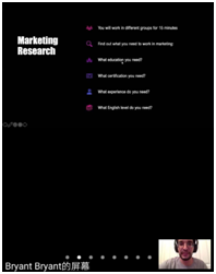 Bryant老师通过Zoom视频会议的方式进行直播授课,根据课程进度呈现合理又美观的PPT。为了帮助同学们理解课程内容,Bryant老师又在Youtube视频网站上找了很多视频。在课堂上通过播放与讲解并行的方式,让同学们在理解的基础上,感受到了课程的乐趣。同时,Bryant老师对中国十分了解,举了很多有关中国的例子,让同学们感到十分亲切。在每次课程结束后,Bryant老师会布置少数作业来帮助同学们巩固课堂上的内容,同时会通过微信群组聊天询问同学们学习的内容和教学效果。在课程结尾阶段,Bryant老师以小组活动的方式结束课程,极大的增加了同学们的积极性和锻炼了同学们的动手能力及口语表达能力。