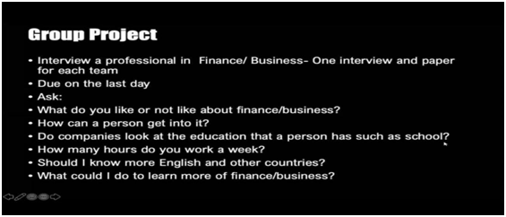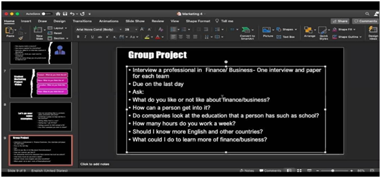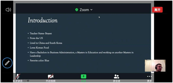 Bryant老师通过ZOOM视频会议的方式进行授课,讲课时为同学们展示易懂且美观的PPT。Bryant老师采用一问一答的教学方式,帮助同学们更好理解知识内容。Bryant老师也在Youtube视频网站上找到许多和学习课程相关的视频资料在课堂上播放,在视频播放的同时进行讲解,让同学们在理解的基础上感觉到课堂的乐趣,增加对课程的兴趣。