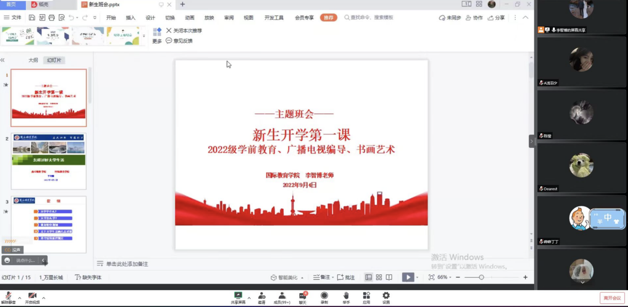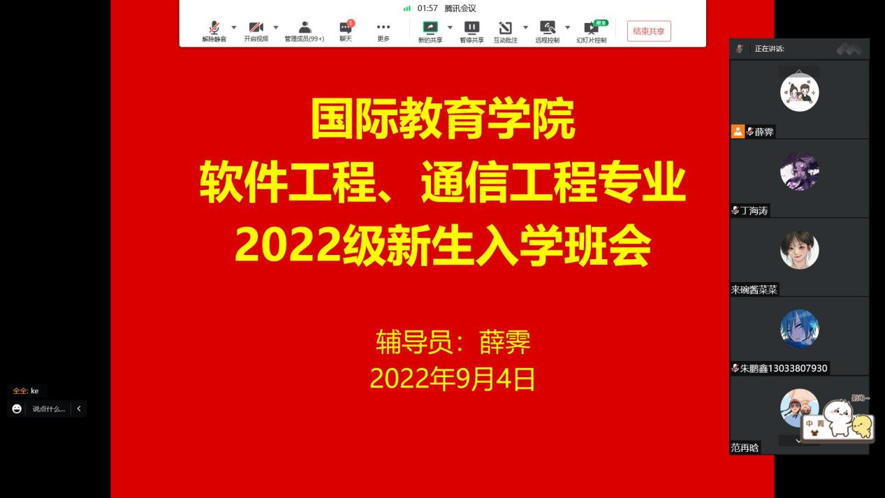 2022年9月3日至4日,yl6776永利集团2022级新生辅导员薛霁、张一荷、李智博老师分别召开2022级新生“开学第一课”主题班会,班会以线上方式进行,由各班级辅导员老师主持会议。