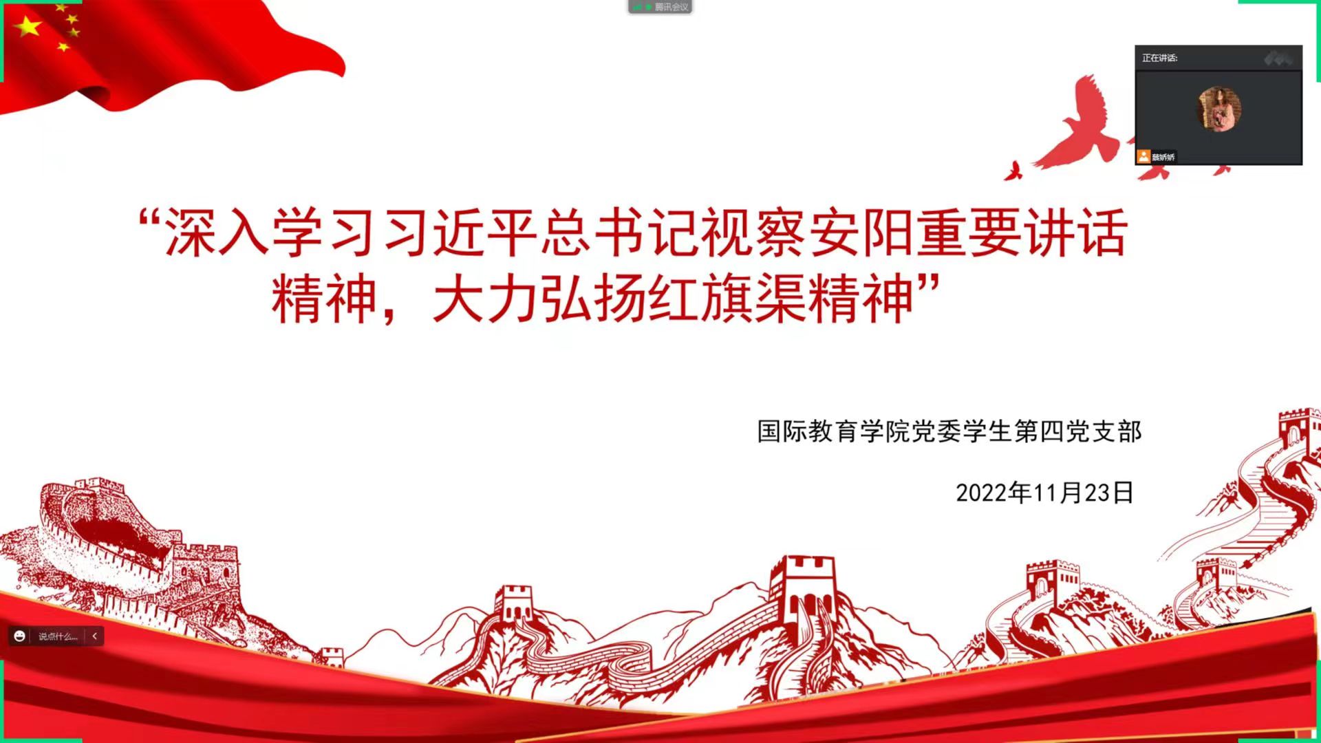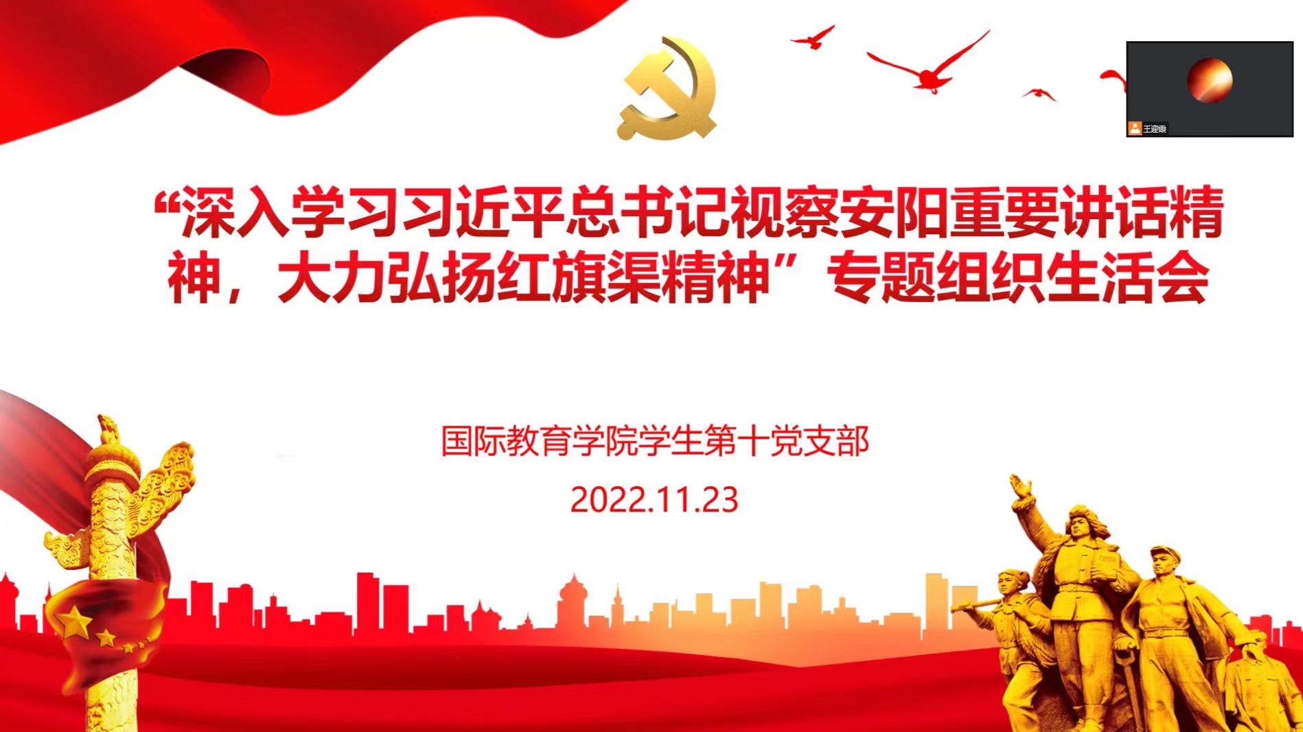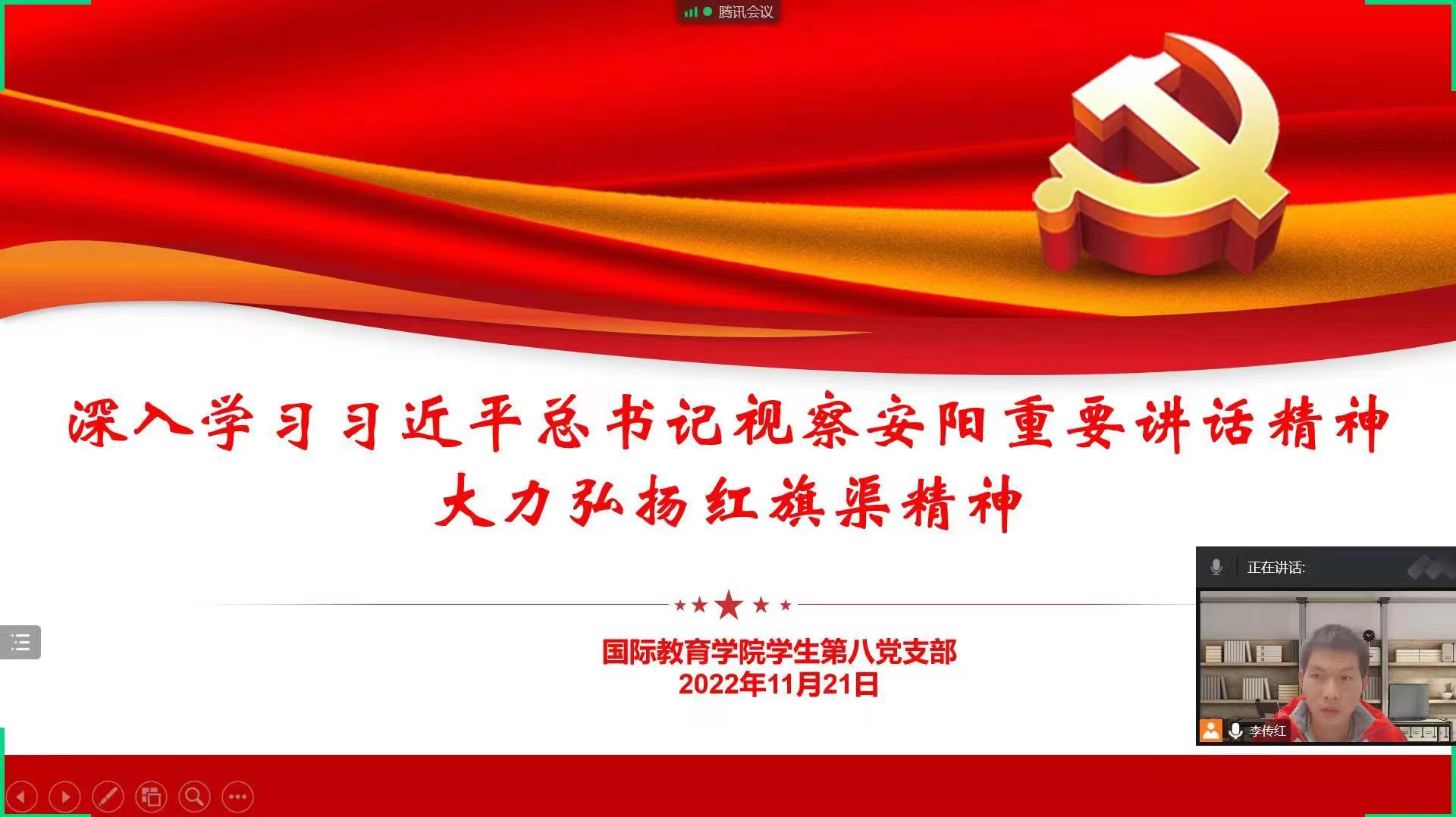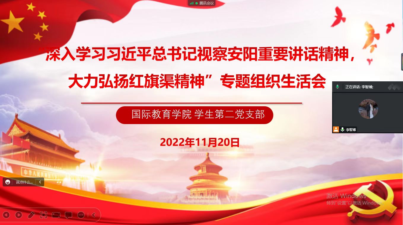11月17日—25日,10个学生党支部分别通过线上方式组织开展了专题组织生活会。各党支部聚焦此次专题组织生活会主题,将学习贯彻习近平总书记视察安阳重要讲话精神与学习贯彻党的二十大精神紧密结合起来,教育引导广大学生党员深刻领会红旗渠精神的丰富内涵和时代价值,深刻感悟并躬身践行红旗渠精神,弘扬伟大建党精神,赓续红色血脉,更好发挥党员先锋模范作用, 以实际行动为学校发展贡献力量。