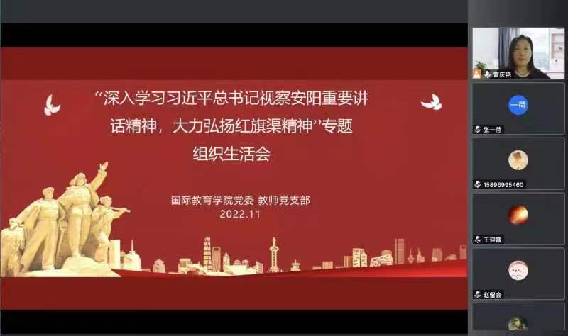 11月20日,教工党支部以线下线上相结合的方式召开专题组织生活会,全体教工党员参加会议,党委书记陈华、院长周运增、党委副书记石贤光以普通党员身份参加此次专题组织生活会,党支部书记曹庆艳主持。会上,曹庆艳传达了习近平总书记视察安阳重要讲话精神,并从修建红旗渠的历史背景、伟大实践铸就红旗渠精神以及红旗渠修建的历史启示等几个方面深刻阐释了红旗渠精神,并组织全体党员集中观看中央电视台《国家记忆》栏目播出的专题片《根脉——红旗渠精神》,进一步深入了解红旗渠精神。陈华对专题组织生活会进行点评,充分肯定了此次专题组织生活会的成效。同时,他要求全体教工党员要以此次专题组织生活会为契机,深入学习、领悟、践行“自力更生、艰苦创业、团结协作、无私奉献”的红旗渠精神,从红旗渠精神中汲取不竭精神动力,激发“越是艰险越向前”的英雄气概和“敢教日月换新天”的昂扬斗志,重整行装再出发,以实际行动推动学院事业高质量发展。