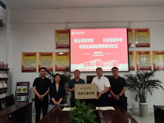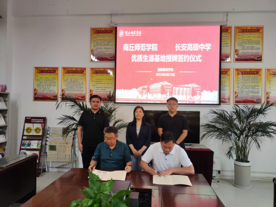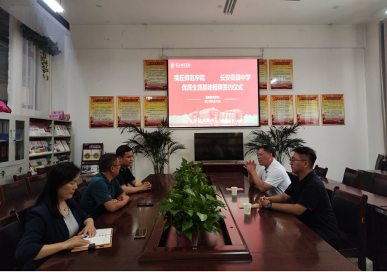 6月19日下午,我院与沈丘县长安高级中学举行“优质生源基地”授牌签约仪式。长安高级中学教务副校长王伯贵、高三年级主任窦敬林,我院党委书记陈华、副院长曹庆艳、团委书记薛霁出席签约仪式。