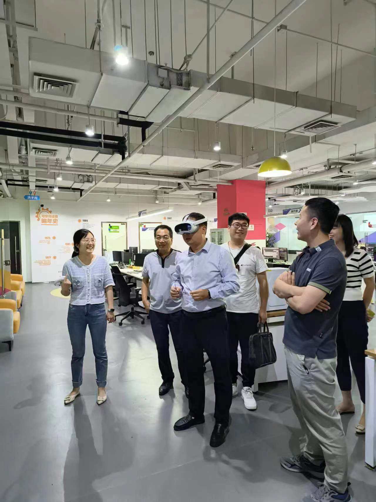 总经理张克发、副总经理张荣接见了陈华一行,双方进行座谈。张荣简要介绍了企业的基本情况、主要产品、服务范围以及人才需求情况,张克发通过PPT对企业开发的AR、VR项目进行现场演示;陈华对企业的热情接待表示感谢,并简要介绍了我校和学院的基本情况、专业设置以及2023届毕业生情况,对软件工程、视觉传达设计和书画艺术等专业毕业生进行了重点推介;双方就建立毕业生实习基地、产学研合作等达成初步共识。随后,陈华一行参观了企业展厅,了解企业发展前景,感受企业文化,体验企业产品。