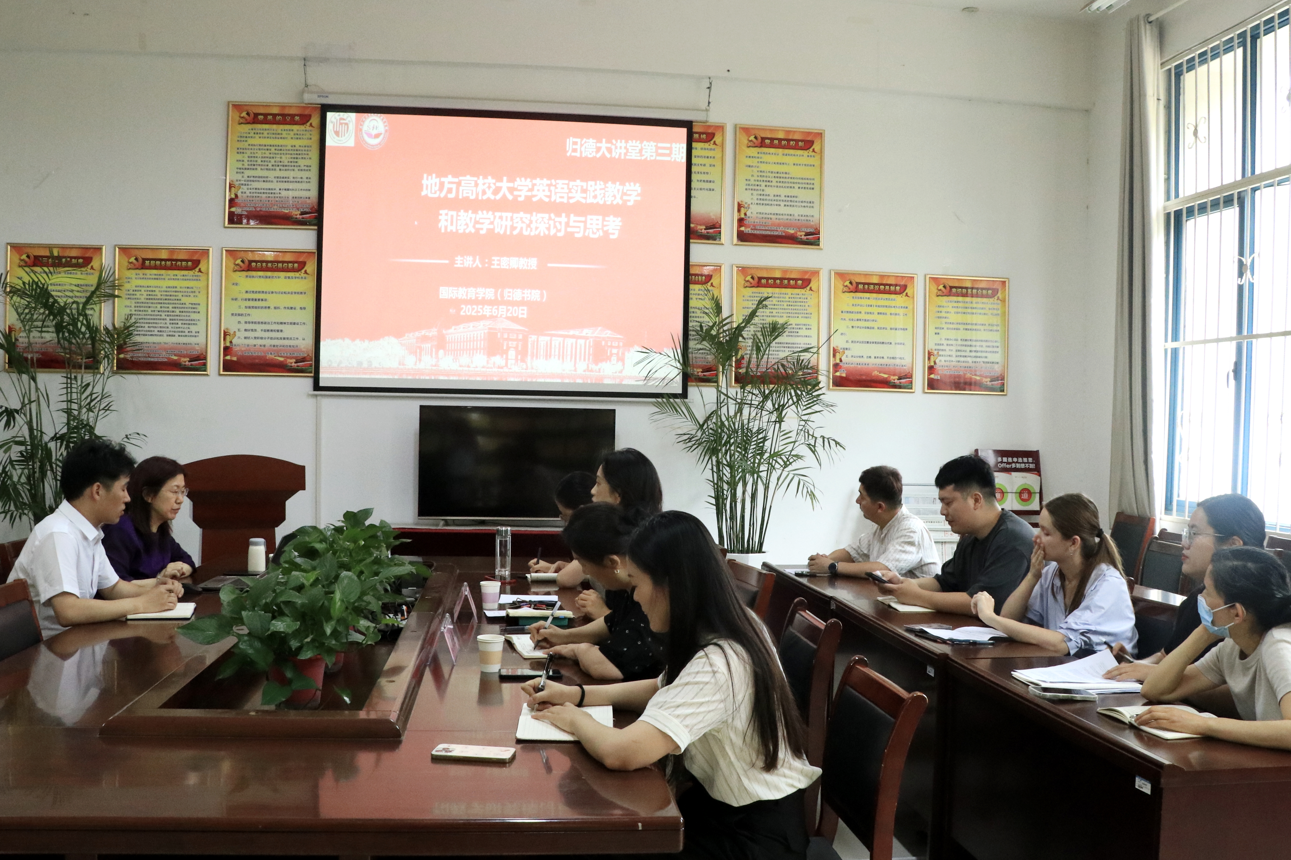 杨静做总结发言,从“守初心、用真心、有恒心”三个层面高度评价了王教授的精彩讲座,也对我院任课教师提出了三点希望:一是积极践行“以赛促教”理念,主动参与各类教学竞赛,将比赛中积累的经验转化为课堂教学的创新动力,提升教学时效性;在“以教促研”方面,立足国际教育特色,结合学院学生特点与国际化办学需求,深入开展教学研究,积极申报教改项目,探索适合国际教育背景下的大学英语教学新模式;三是注重“教研融通”,让研究成果反哺教学实践,助力培养国际传播人才。