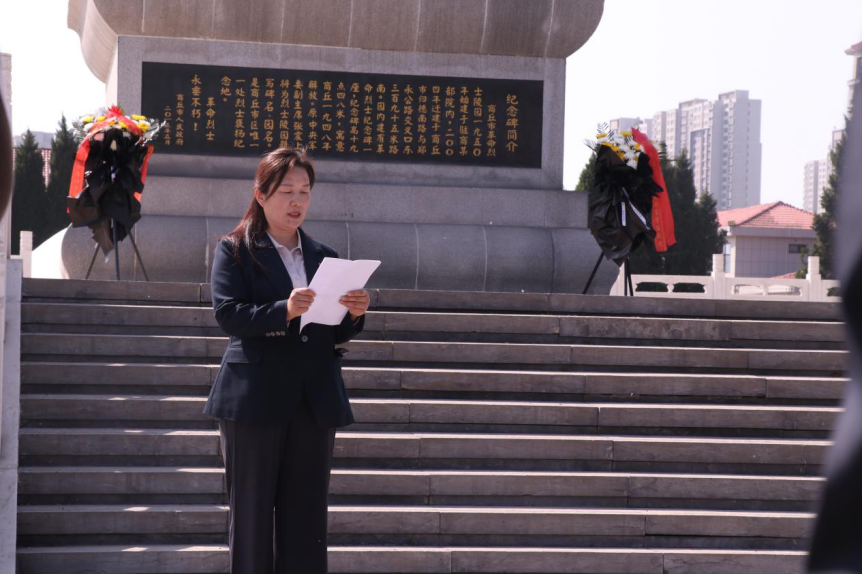 紧接着,党委书记曹庆艳在纪念碑前现场讲授党课,她深情回顾革命先烈的英雄壮举,结合学院育人使命,勉励全体师生党员将爱国之情转化为报国之行、治学之举。