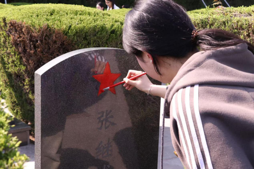 活动最后,党员们俯身擦拭墓碑、拂去尘土,为墓碑上的红星描红上色,以赤诚之心守护英烈荣光,砥砺初心使命。