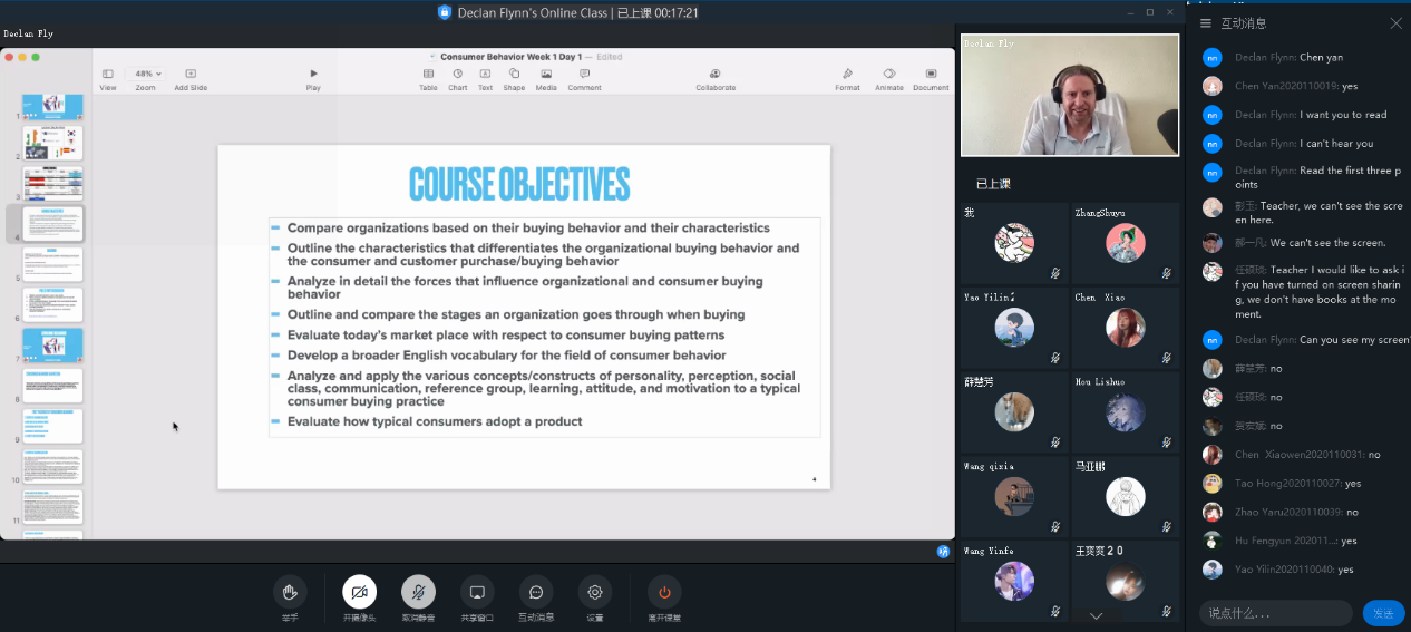 根据中外合作办学的要求,yl6776永利集团为2020级物流管理专业学生引进课程Consumer Behavior(《消费者行为学》)。此次线上授课的是Declan Flynn教授。