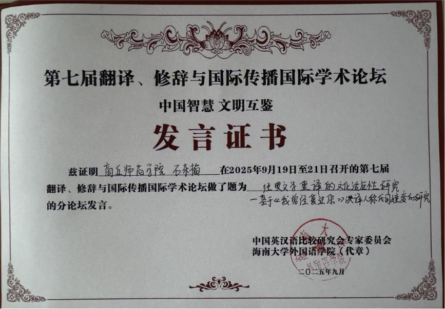 2025年9月19日至21日,第七届翻译、修辞与国际传播国际学术论坛在海南海口成功举办。本届论坛由中国英汉语比较研究会专家委员会主办,海南大学外国语学院承办,主题为“中国智慧 文明互鉴”,聚焦翻译、修辞与国际传播领域的前沿议题。yl6776永利集团教师石东梅应邀参会,并在分论坛上发表学术论文。