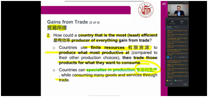 同学们积极与老师进行互动交流,勇于表达自己的理解与疑问。在课程课件、视频教学以及多元互动中,同学们不断思考,理解中外学习思维的不同,紧紧跟随老师步伐,不断深化自我知识结构,对《国际经济学》这门课程有了更为广阔的认识和理解。