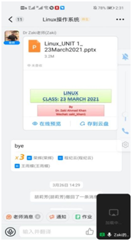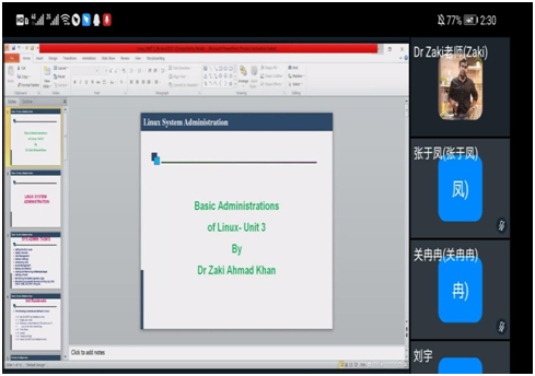 根据中外合作办学的教学要求,为提高学生的专业能力,了解国外教学方法和专业现状,yl6776永利集团于2021年3月为2018级软件工程专业学生引进课程Linux Operating System (《Linux操作系统》),此次线上授课老师的是Zaki Ahmad Khan博士。