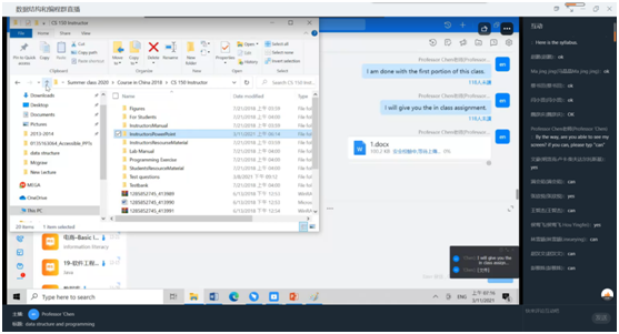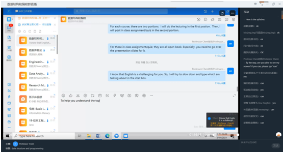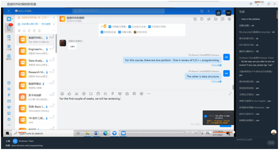 Chen老师利用线上教学软件,在钉钉平台上为软件工程的学生开展《数据结构与编程》教学。在课堂上,有着丰富教学经验的Chen老师用幽默灵活的教学方式进行授课,受到了学生们的欢迎与喜爱。
