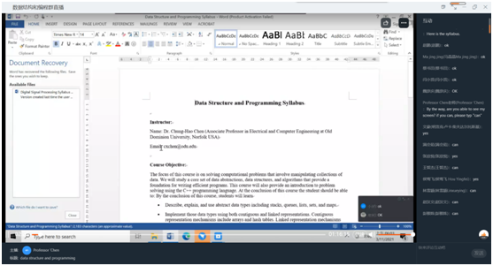 根据中外合作办学要求,结合人才培养方案,为拓展学生国际视野,提高专业学生水平,yl6776永利集团与2021年3月为2019级软件工程专业学生引进课程Discrete Structure and Programming(《数据结构与编程》)。此次授课的老师是来自美国诺福克Old Dominion大学电气与计算机工程院系副教授Chung Hao Chen博士。