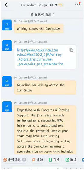 课前,Dosset老师为同学们上传教学资料,让大家了解讲解内容与重、难点。课上,Dosset老师用诙谐幽默的语言、简单易懂的词汇向同学们阐述Curriculum Design课程的目的和意义。教学中,老师还借助教学视频和通俗易懂的案例帮助同学们更好地理解教学重、难点。Dosset老师强调,教师在培养与教育幼儿时,应极具耐心和爱心,语气应尽可能轻柔。她指出,在开展学前教育教学的过程中,教师应当培养幼儿树立积极向上的理念,引导儿童更加良好得发现生活之美,进而促进儿童健康的心理的有效建立。