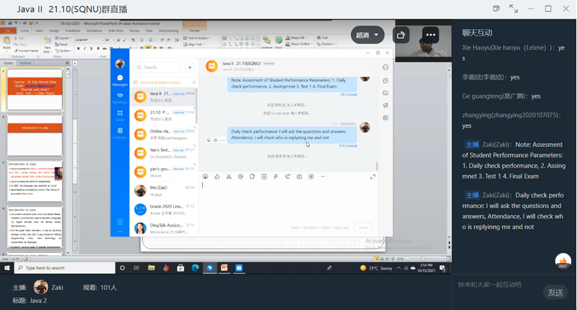 Khan老师在课程的开始给同学们介绍了课程要求和考核标准。课堂上,老师用标准的发音给同学们讲解了Java的发展史,使同学们更加深入的了解了Java语言并对此次课程产生了浓厚的兴趣。