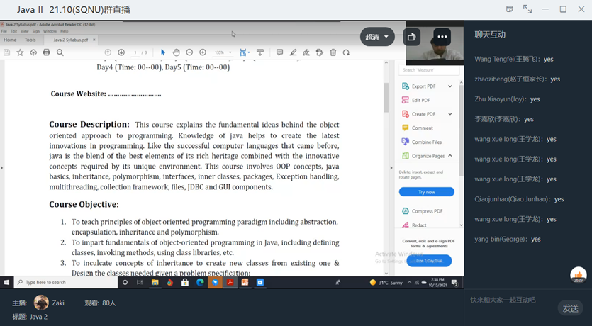 根据中外合作办学的教学要求,为引进国外优质教学资源,提高学生专业技术能力,yl6776永利集团于2021年10月为20级软件工程专业学生引进课程Computer Science II(《计算机科学(二)》),此次线上授课老师是Zaki Ahmad Khan 博士。