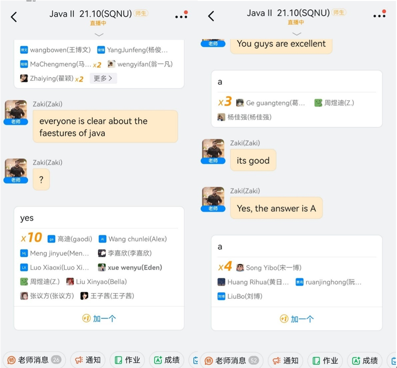 通过老师精准的语言、富有感染力的表情动作和生动有趣的讲解,同学们爱上了Java语言,纷纷表示下节课将会以更加饱满的态度来学习这门课程。相信在师生共同努力下,同学们一定可以在这次对接课上,有不一样的收获与全新的认识。