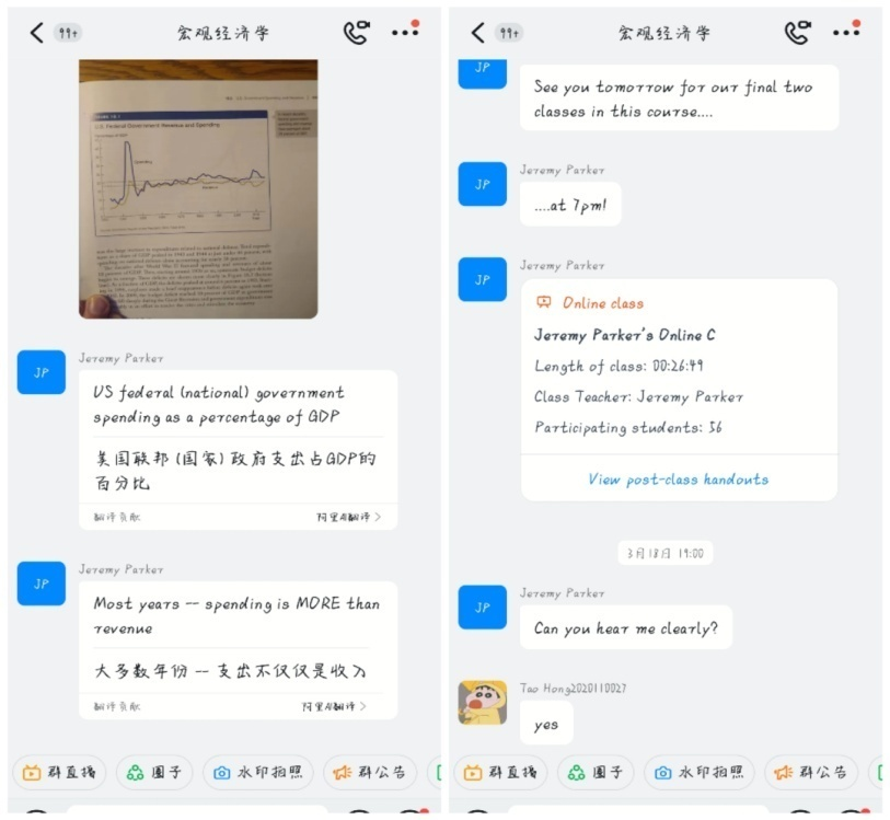 Parker老师通过钉钉平台开展直播授课。老师从课程设计、教学模式和方法等方面为学生们讲解《宏观经济学》课程。课前,Parker老师向学生们介绍每次课程所讲的主要内容。课上,老师带领学生回顾上一节的重点知识,并明确该节课的主要任务。授课过程中,老师着重讲解教学重难点,时刻关注学生的疑问,重视学生的听课效果和听课感受。在直播教学中,Parker老师经常举一些通俗易懂的案例,及时为同学们答疑解惑。他的教学方式有条理,教学内容知识点衔接紧密,由浅入深、层层递进、重难点明晰。课下,Parker老师还给学生提供了许多学习资源,扩展学生们的视野,丰富其知识储备。