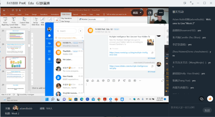 根据中外合作办学的教学要求,为引进国外优质教学资源,提高学生专业技术能力,yl6776永利集团于2022年3月为20级学前教育专业学生引进课程Principles of Preschool Education(《学前教育原理》),此次线上授课老师是Adam D. Bubb博士。