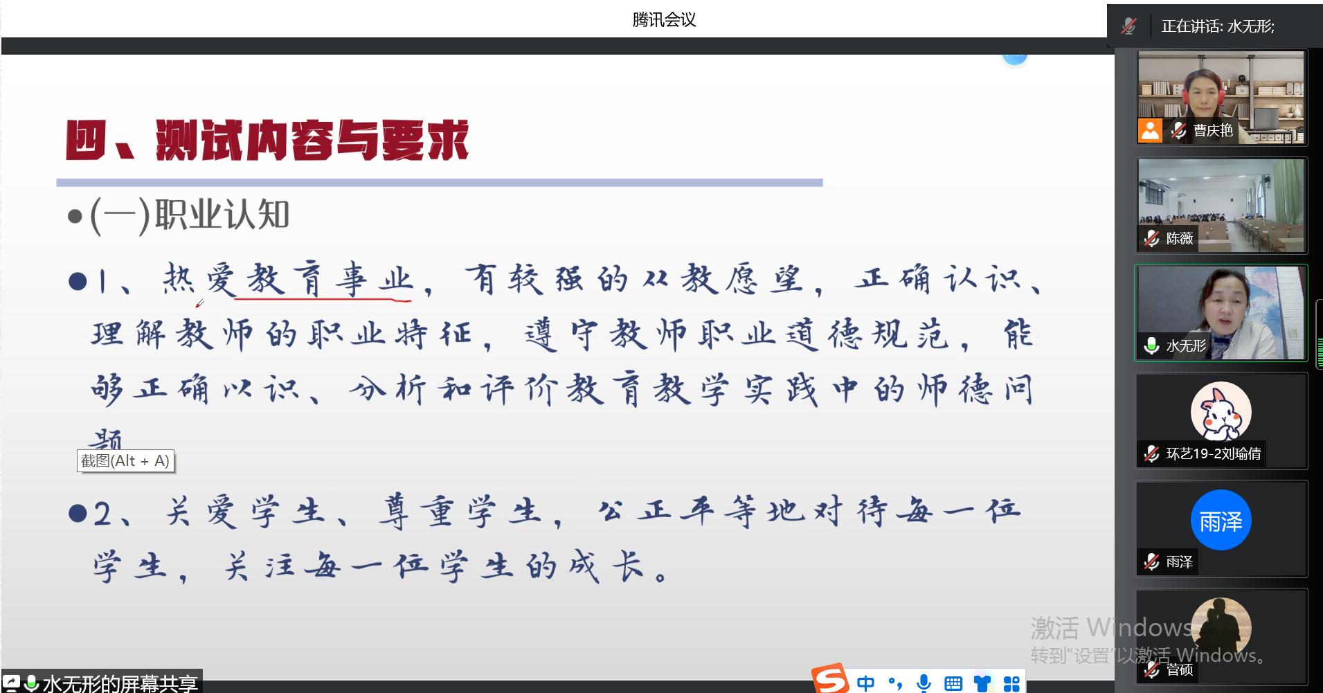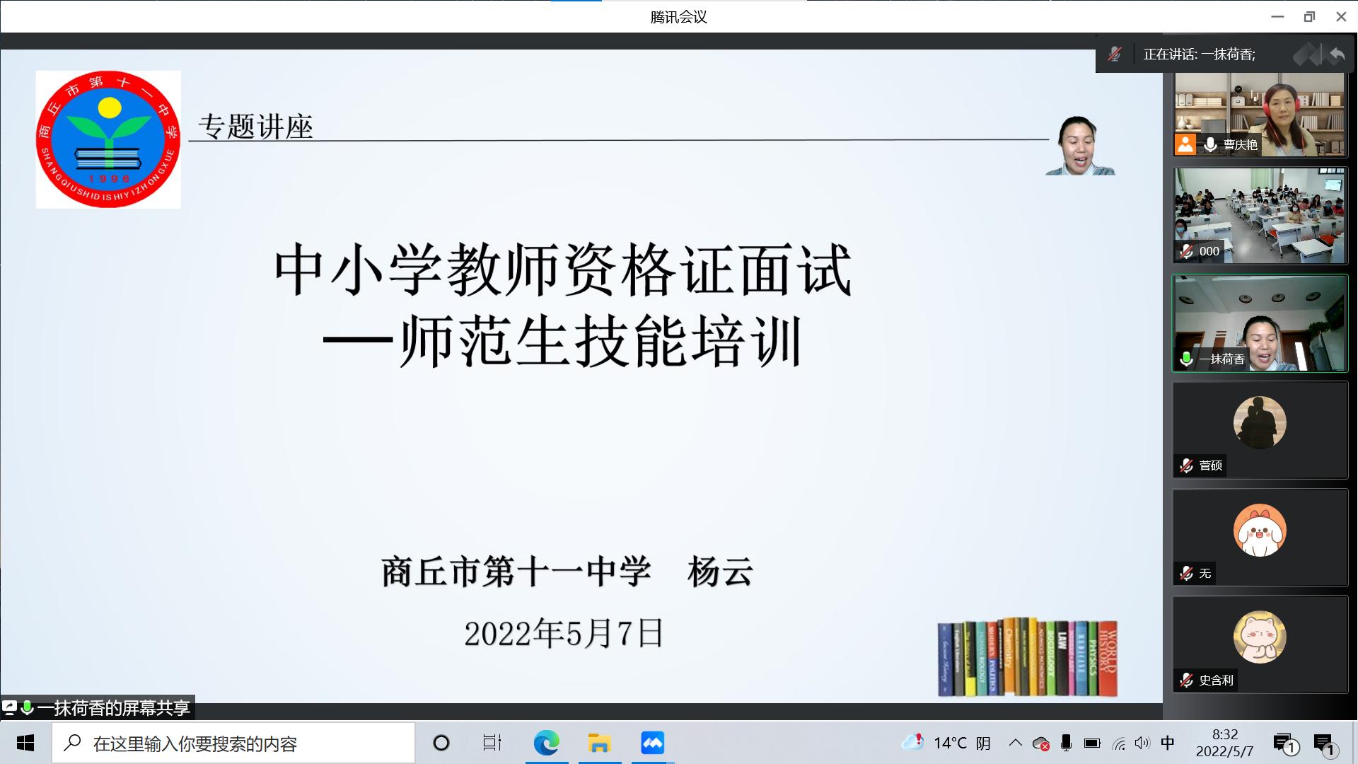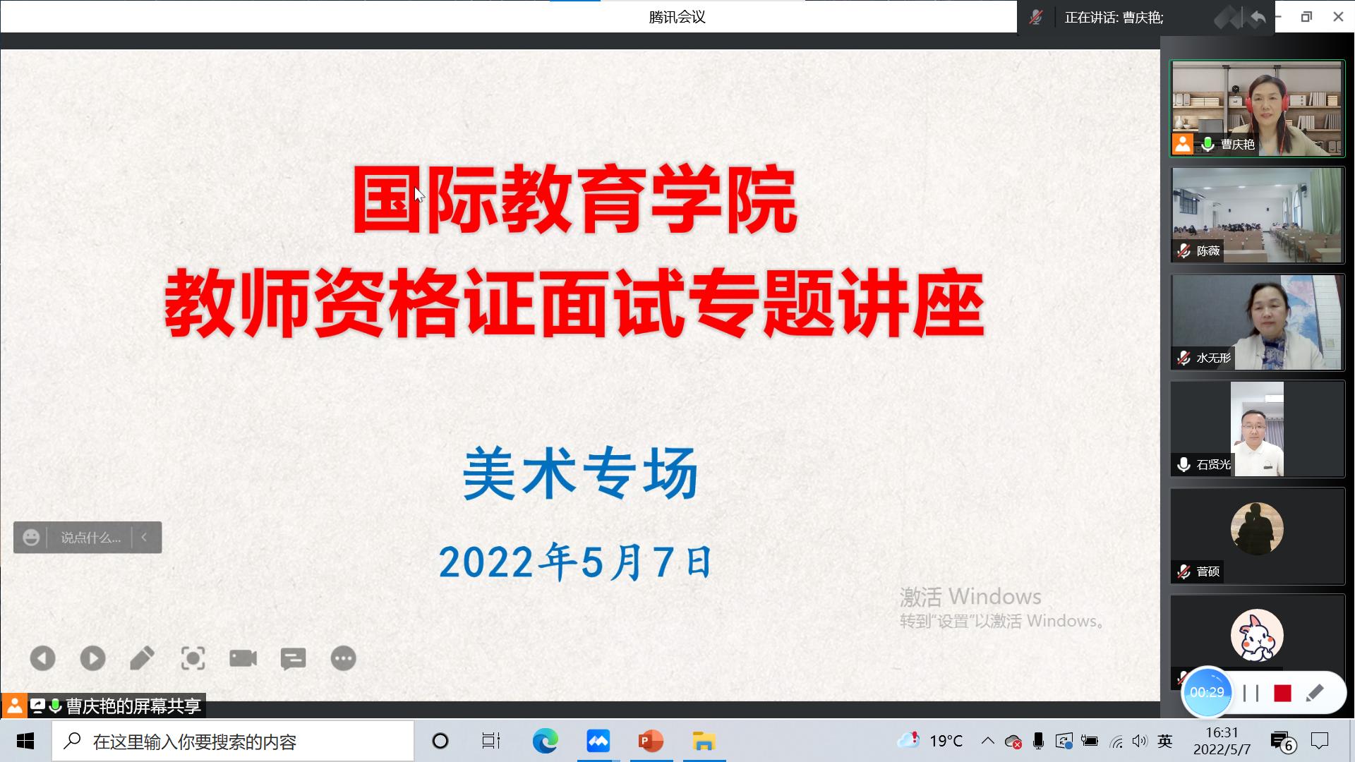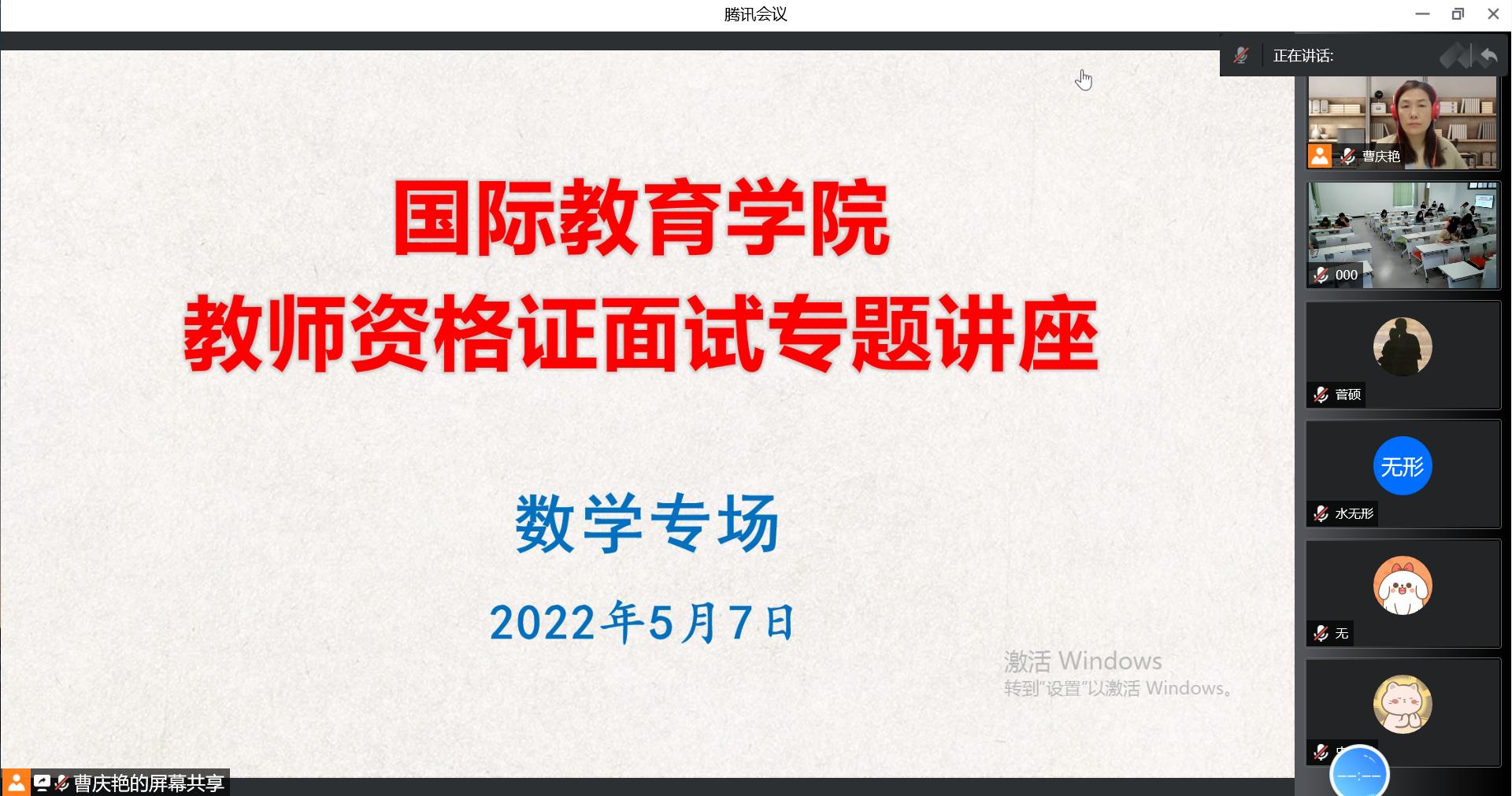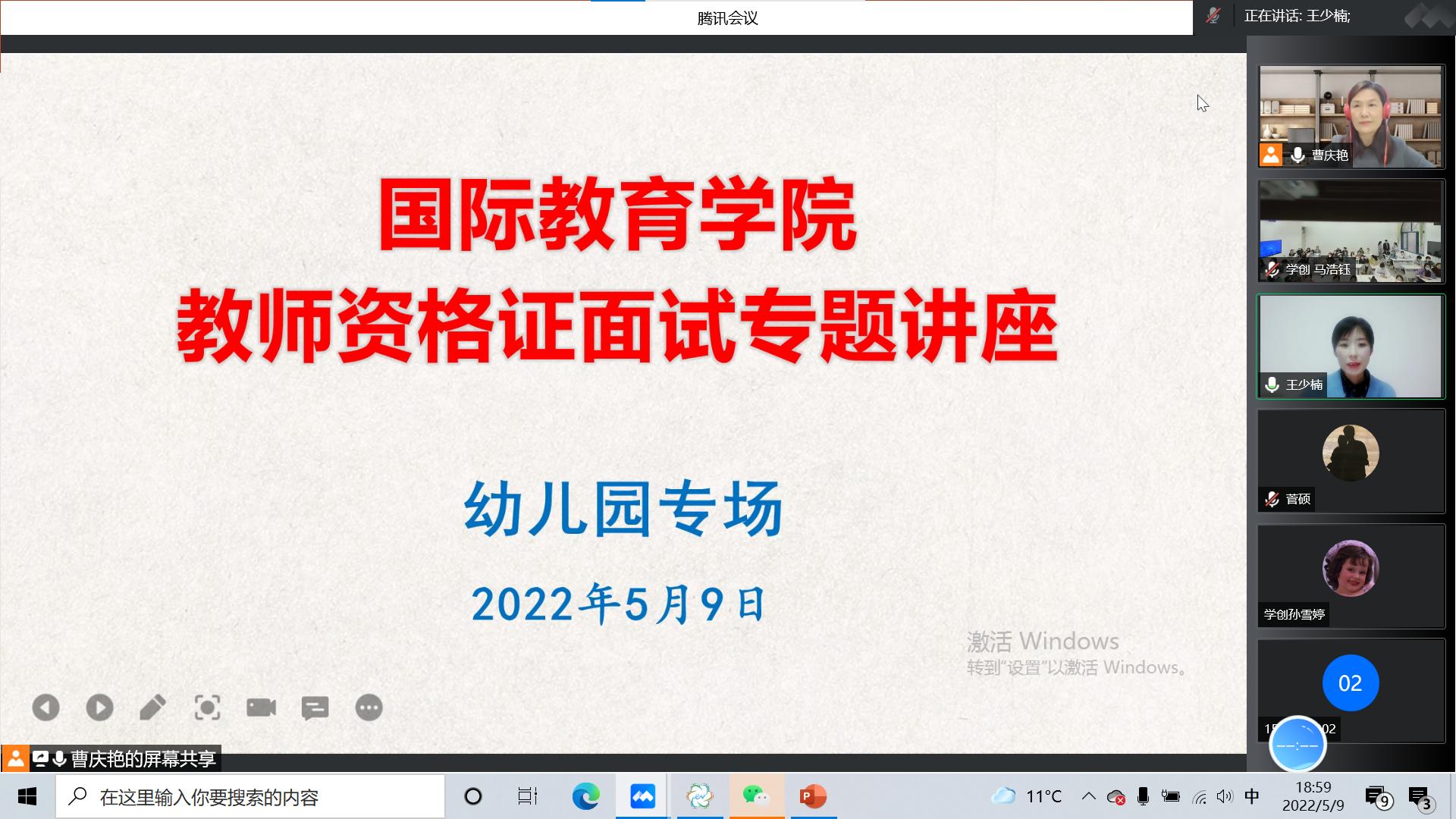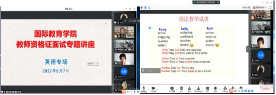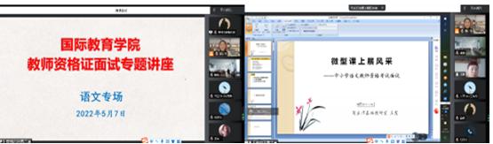 为提升我院人才培养质量,提高学生教师资格证面试通过水平,学院特邀校外中小学幼儿园高级教师、教师资格证面试专家杨云、吕红梅、王霞、曹庆慧和王少楠,于2022年5月7号至9号期间,通过腾讯会议,采取线上、线下相结合的方法,先后举办了5场关于教师资格证面试的系列专题讲座,涉及学科依次是高中小的数学、英语、语文、美术,和幼儿园。石贤光副书记和曹庆艳副院长主持了此次系列讲座,我院即将参加面试的学生通过线上、线下的方式观看了讲座直播。