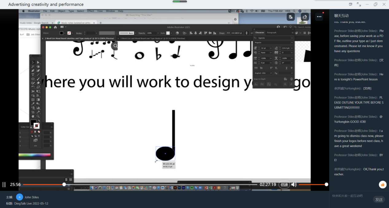 线上直播过程中,同学们配合John Stiles教授的课堂教学,积极和老师互动交流,John Stiles教授耐心为同学们解答,为同学们介绍展示了一些优秀的设计作品,并亲自使用设计软件向大家示范怎样进行logo设计及配色。线上直播结束后,John Stiles教授给同学们布置了一些作业让大家线上、线下分别完成。