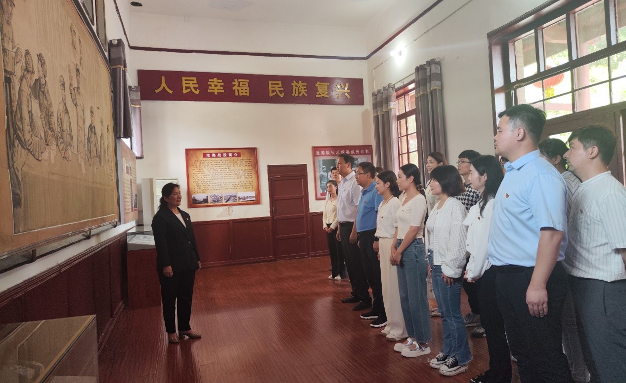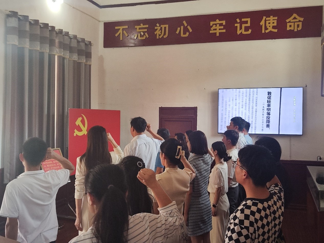 在中共中央中原局扩大会议秘书处旧址,大家怀着崇敬的心情举起右拳,面对党旗集体重温入党誓词。