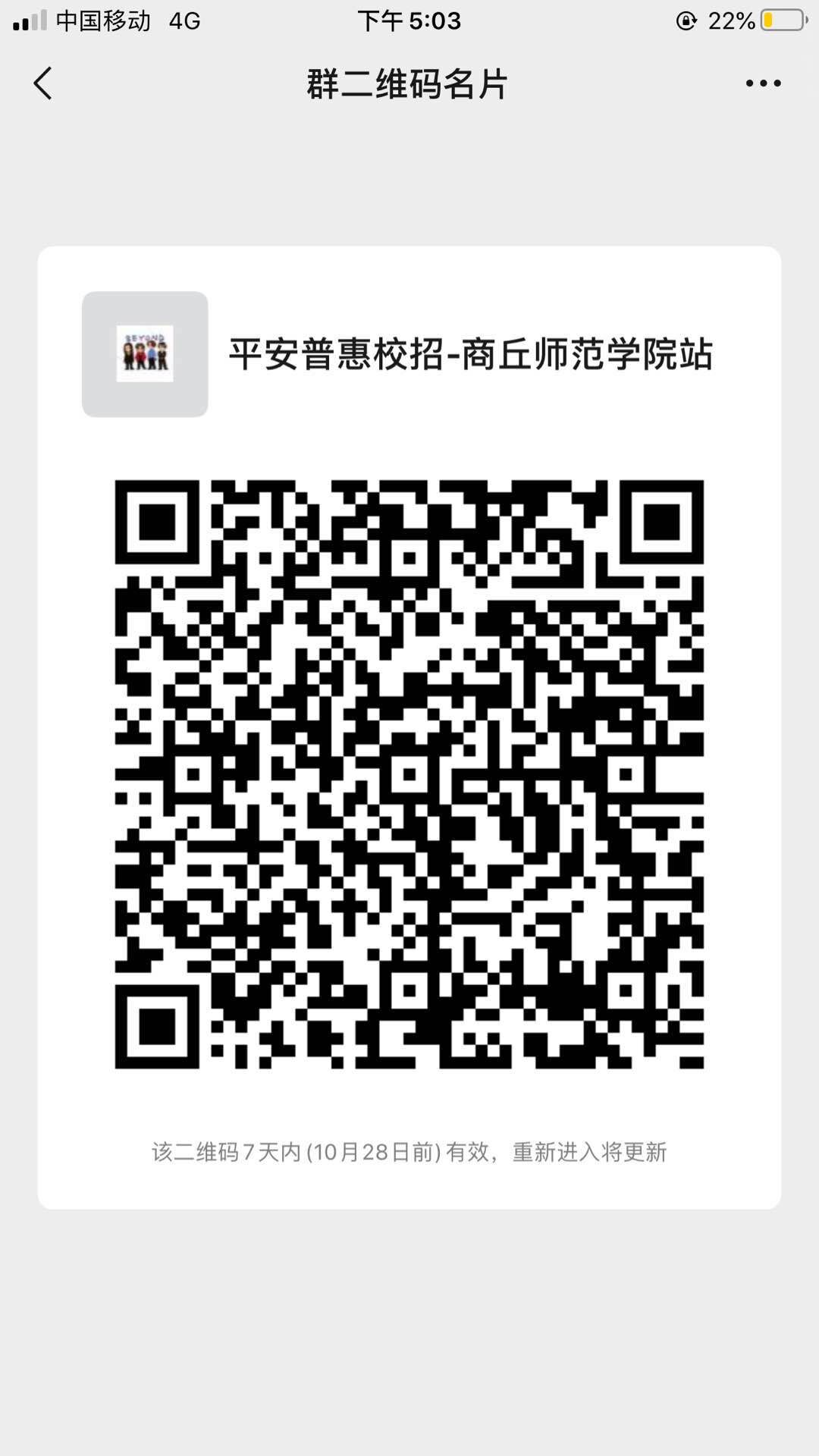【10.22】本周四下午14:00梁园校区求真楼4楼就业服务中心-------------------------------【公司简介】「平安普惠」中国平安集团专业子公司之一,致力于以创新科技和完善风控协助广大小微型企业主和个体工商户等普惠金融人群获得专业借款服务。【招聘岗位】远程客户经理【岗位要求】①大专及以上学历的21和20届毕业生②普通话标准,善于表达③性格开朗有耐心,抗压能力强【工作地点】上海市浦东新区【发展路线】销售管理和业务精英并进【薪酬待遇】前3个月综合月薪8500元,全体员工平均月薪13000元以上【福利】六险二金、过节费、生日福利、国内豪华游等激励 请加微信群沟通宣讲会详情:扫码进群 现场礼物 抽不停 我们在等你,不见不散