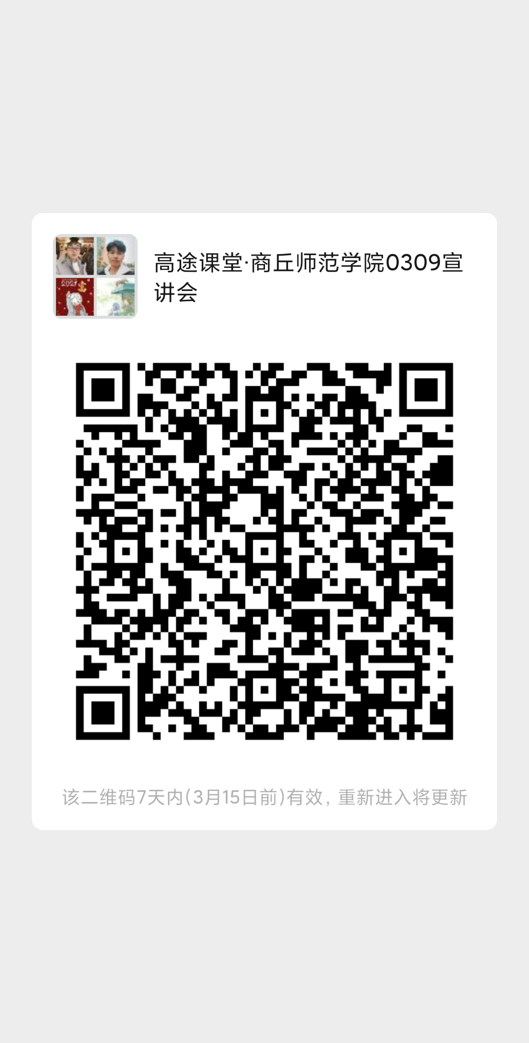 北京高途云集教育科技有限公司专场招聘会1、招聘时间:2021-03-09 13:40-16:002、招聘地点:梁园校区智园楼320教室3、联系方式:张庆波 155158523514、招聘岗位及薪资:语数英物化生各科辅导老师/小初高辅导老师 6k-8k、K12在线教育辅导老师/在线长期班辅导老师 8k-10k、在线短期班辅导老师 10k-15k5、详情点击: https://jyzd.sqnu.edu.cn/module/newsdetail/id-70562/nid-1535有意向的同学可以扫码进群啦~