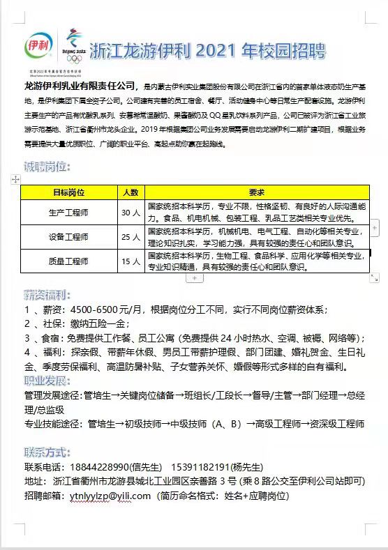 浙江龙游伊利乳业有限责任公司校园招聘