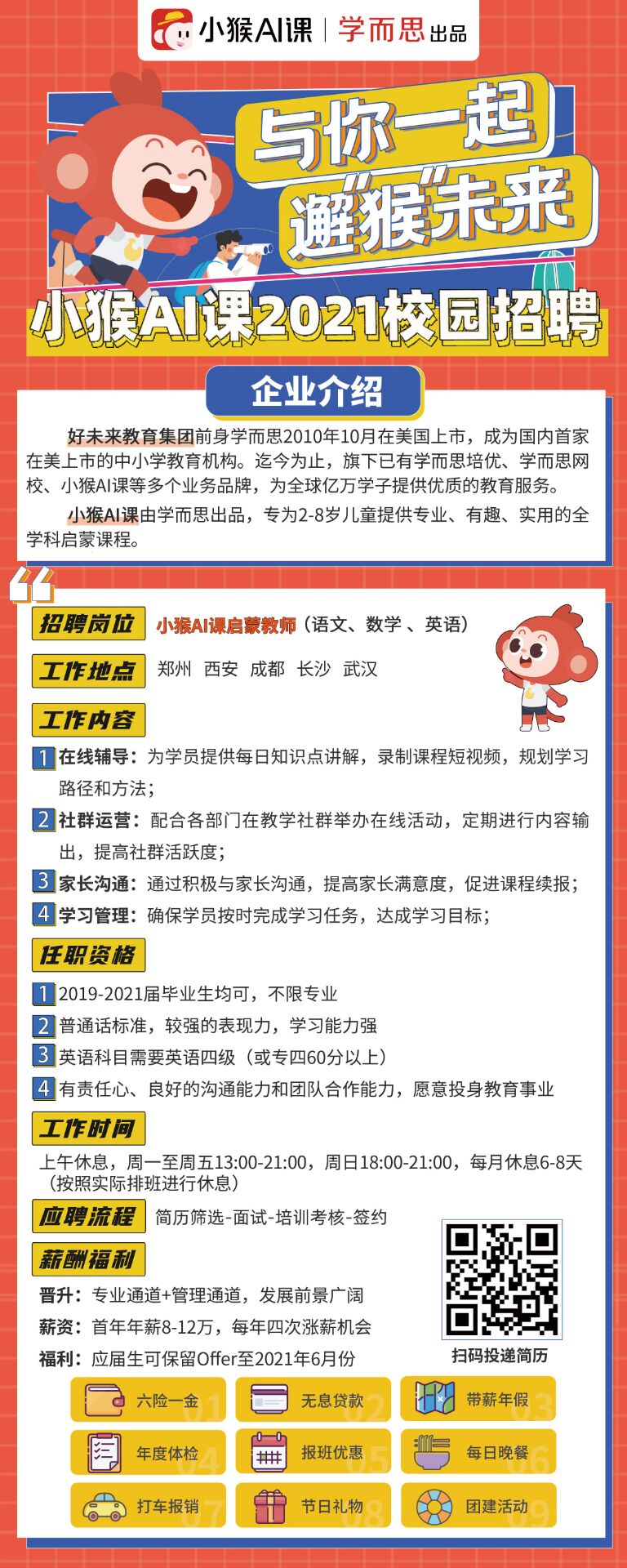 【岗位】小猴AI启蒙课程辅导老师-郑州岗(语数英可选)【薪资待遇】六险一金 月薪6-8k 晋升通道完善 节假日礼物不停【岗位要求】本科以上(不限专业,四年制两年制均可,专科需要教育相关专业) 选择英语科目需要英语四级,语文数学不要求【投递方式】简历投递通道已经提前开启,可扫码线上投递也欢迎同学4月17日(本周六)前往校内双选会C区-4展位,进行现场岗位咨询及简历投递【联系方式】刘老师 QQ 709610825