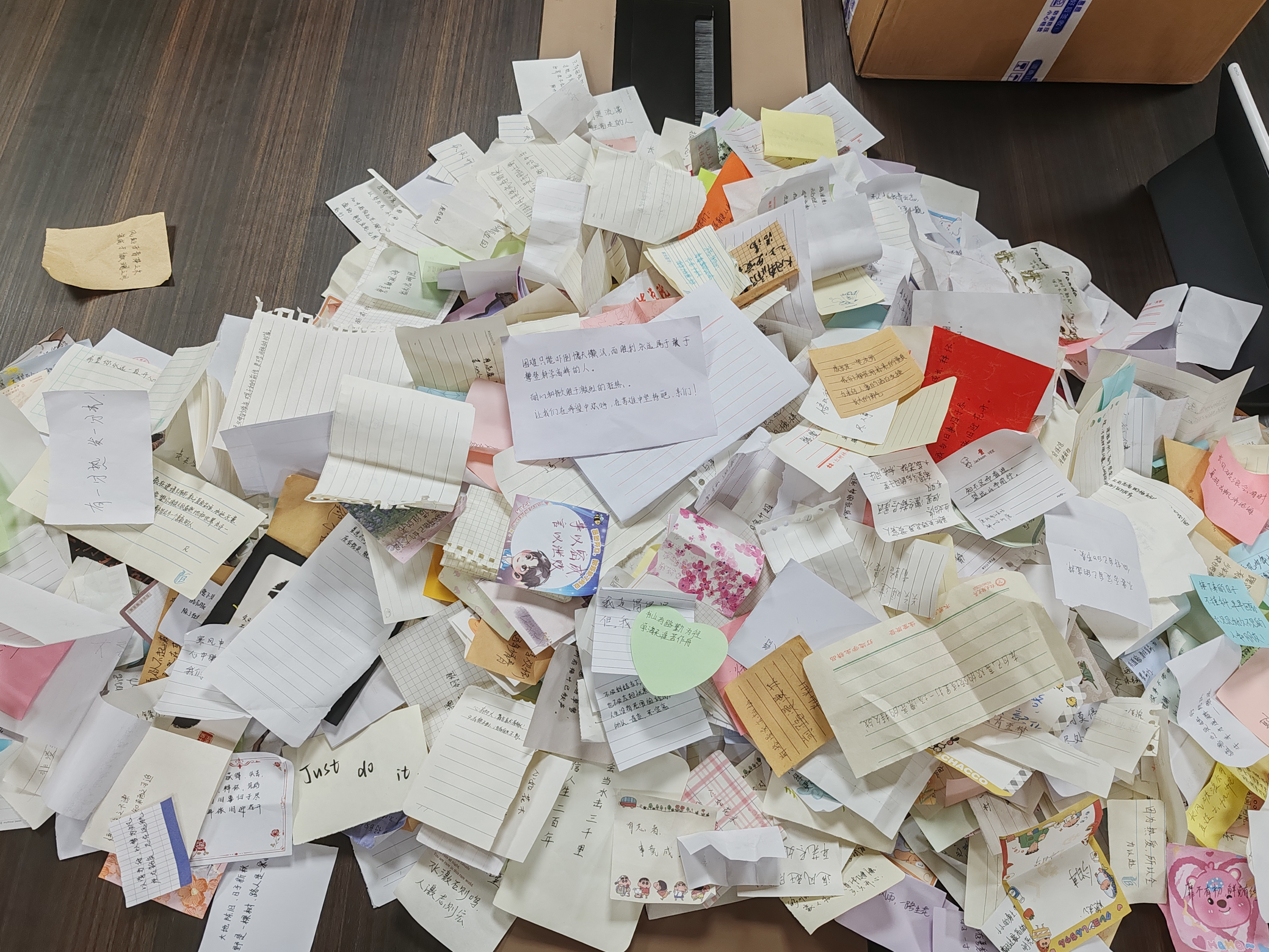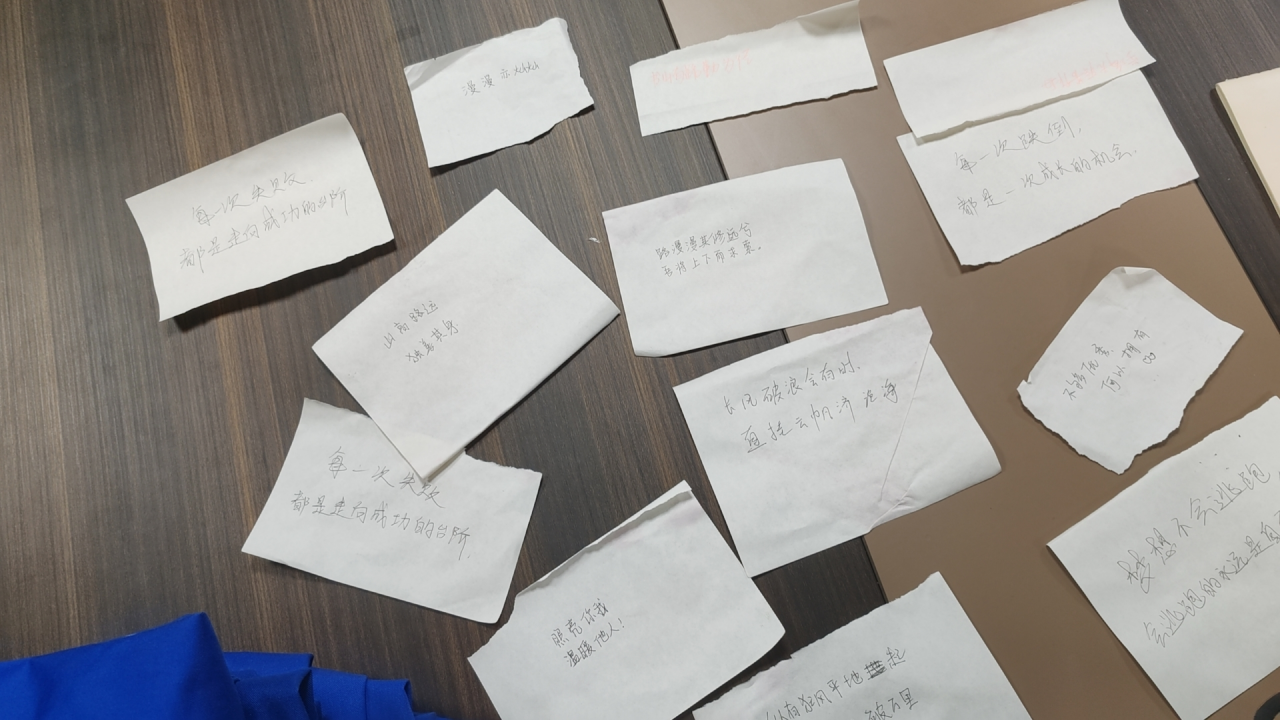 活动期间,同学们认真地在纸上写下了自己的座右铭或鼓励的话,激起自己内心深处的动力。同学们提交的作品风具有书生意气,挥斥方遒,以精神昂扬,人生不言弃的精神状态开启新的征程。活动结束后,生活部工作人员收集了同学们带有励志鼓舞字样的作品。